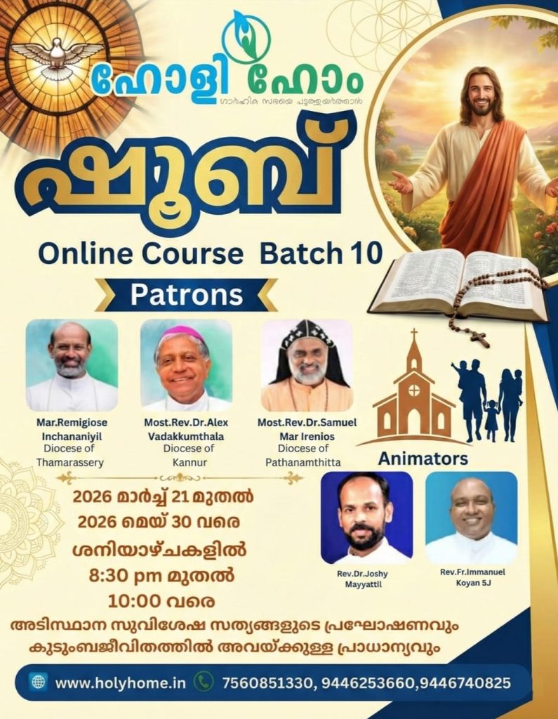ഹോളിഹോംമിനിസ്ട്രിയുടെ നേതൃത്വത്തിൽ 2024 ഡിസംബർ 28 മുതൽ 2025 മാർച്ച് 1 വരെ എല്ലാ ശനിയാഴ്ചയും രാത്രി 8.30 മുതൽ 10.00 വരെ (10 ആഴ്ച്ച) ZOOM പ്ലാറ്റ്ഫോമിൽ ലോകത്തിന്റെ വിവിധഭാഗങ്ങളിലുള്ളവർ ഒന്നിക്കുന്നു. പങ്കെടുക്കാൻ താൽപര്യമുള്ളവർ കൂടുതൽ വിവരങ്ങൾക്കായി 9961318814, 7560851330 എന്നീ നമ്പറുകളിൽ  ബന്ധപ്പെടുക.